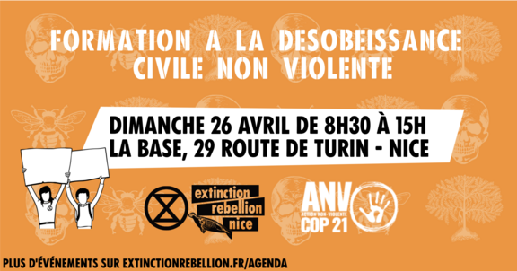 Pour préparer ensemble la suite du combat pour un monde plus respectueux de la Nature et des générations actuelles et futures, ANV-COP21 et Extinction Rebellion Nice (XR) organisent une journée de formation à la désobéissance civile non violente, pour renforcer nos rangs ou créer vos propres actions !